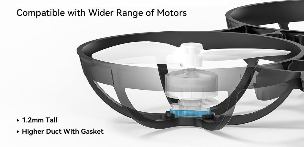 - The duct diameter is enlarged from 32mm to 34.9mm, which improves compatibility and avoids propeller strikes.