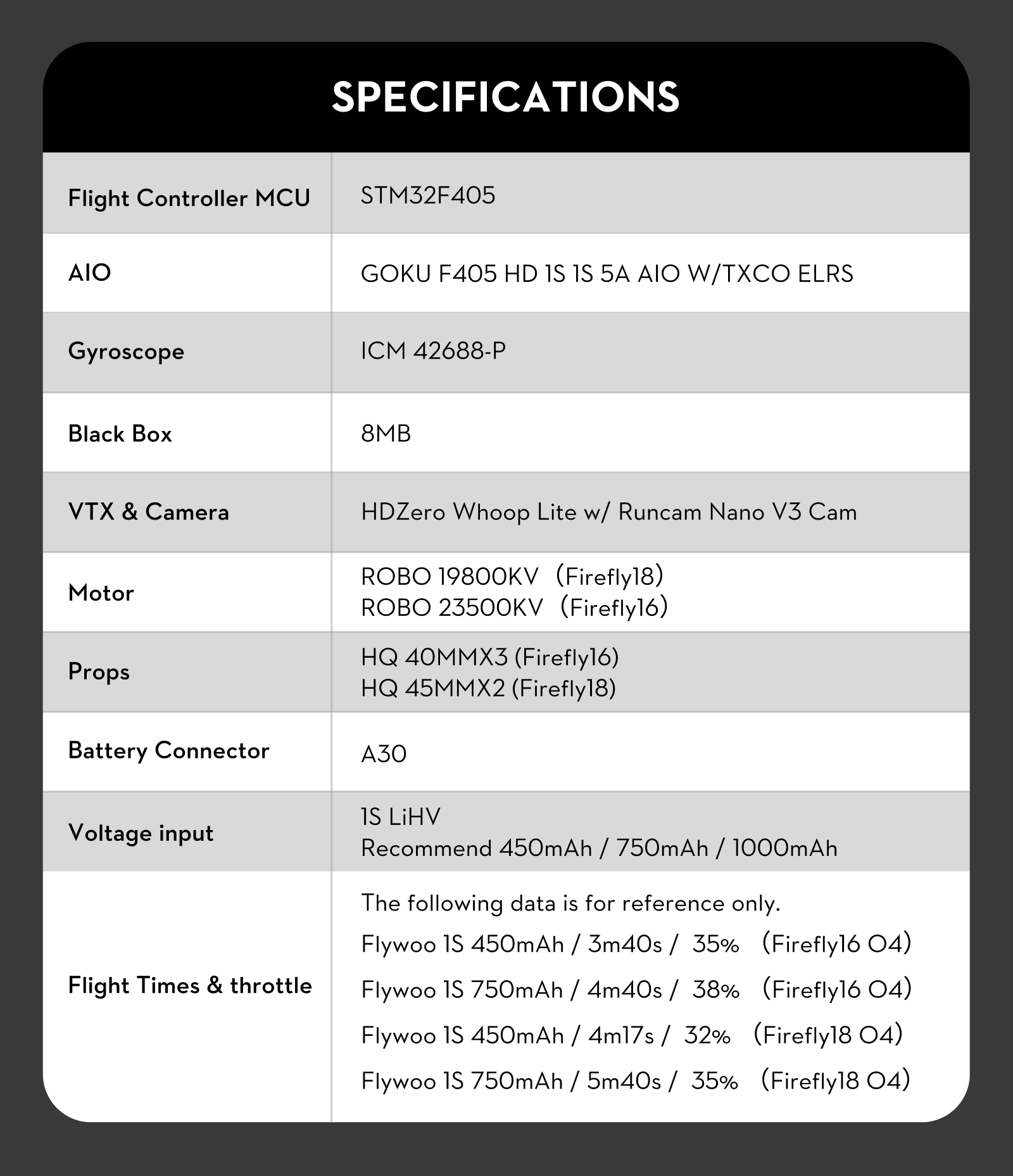 Flywoo 1S 450mAh / 3m40s / 35% (Firefly16 ) Flywoo 1S 750mAh / 4m40s / 38% (Firefly16 ) Flywoo 1S 450mAh / 4m17s / 32% (Firefly18 ) Flywoo 1S 750mAh / 5m40s / 35% (Firefly18 ) |