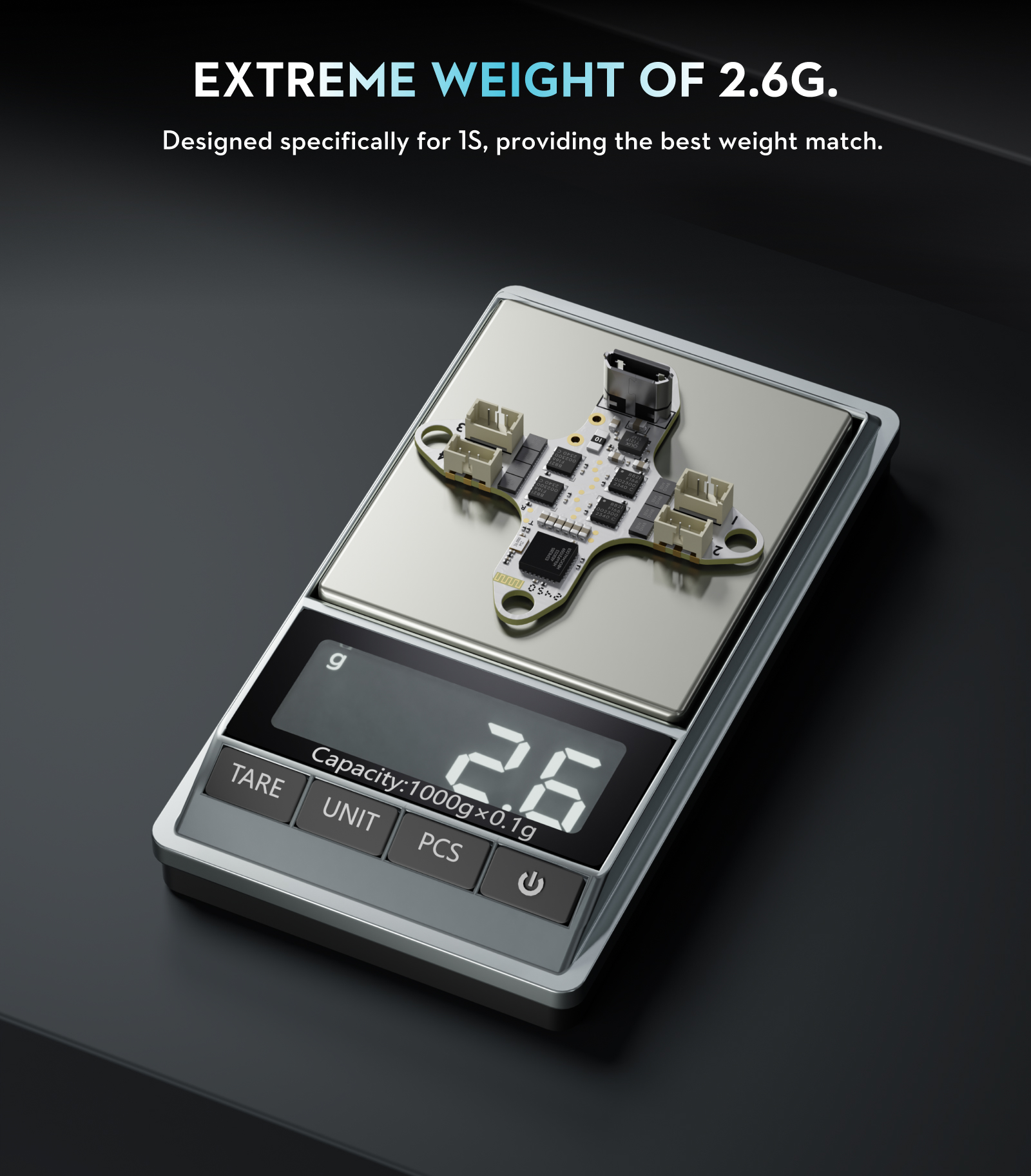 At its core is the STM32F405 BGA micro MCU, delivering 168MHz high-frequency performance, low power consumption, and a mere 2.6g weight. Its innovative cross-shaped design fits all 1S frame kits.