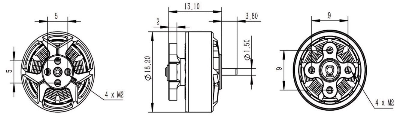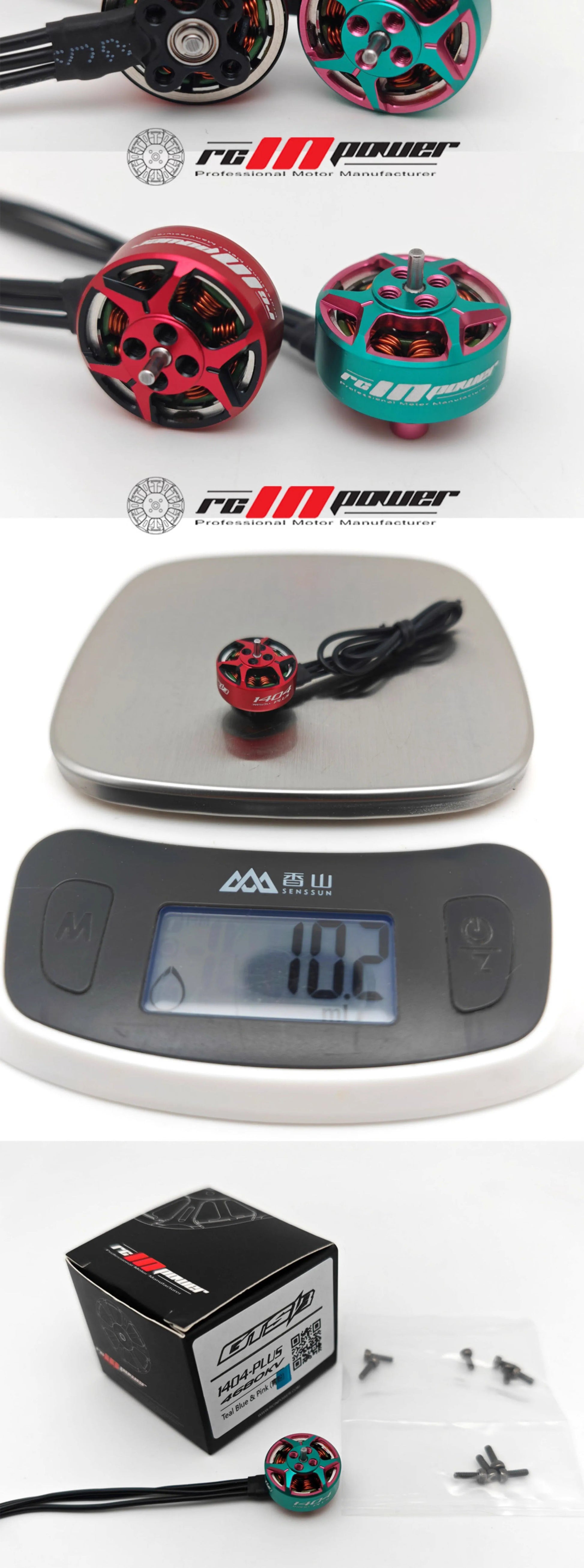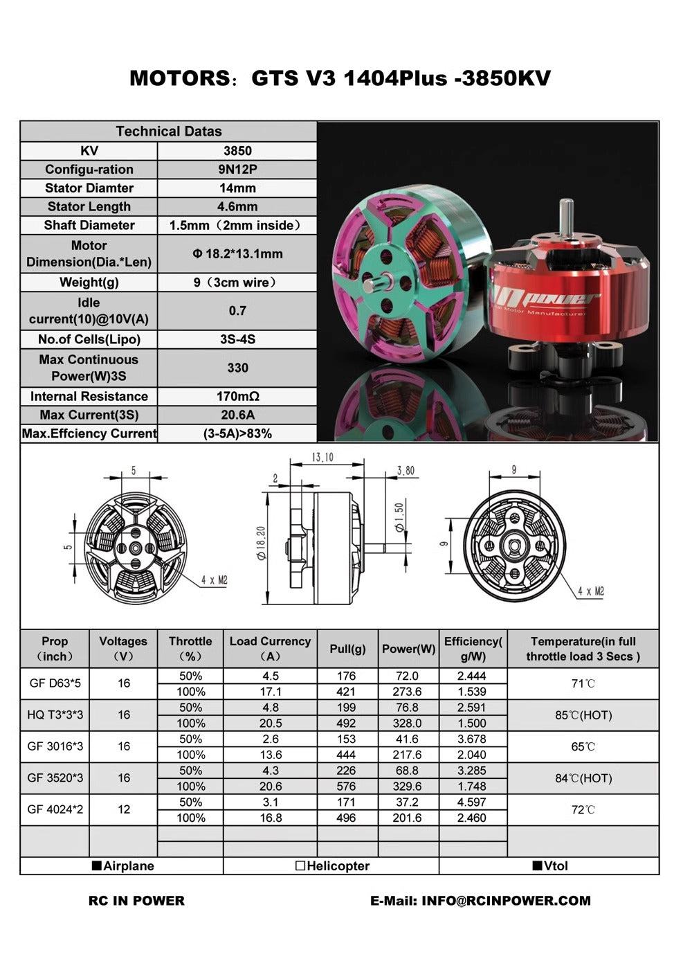Choose this GTS V3 1404.6 motor from Rcinpower for your FPV drone. It has a 1.5 mm shaft and 9 x 9 mm mounting holes. The motor weighs about 9 g and works with a 3-4S or 4-6S LiPo battery depending on its power (not included).